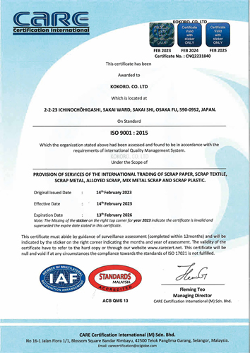 登録番号 CNQ10211764 登録事業者名 ココロ商事株式会社 適合規格 ISO 9001 履歴 発行日:2023年2月14日